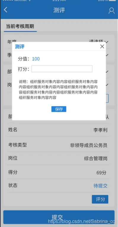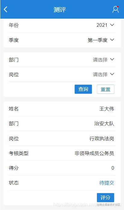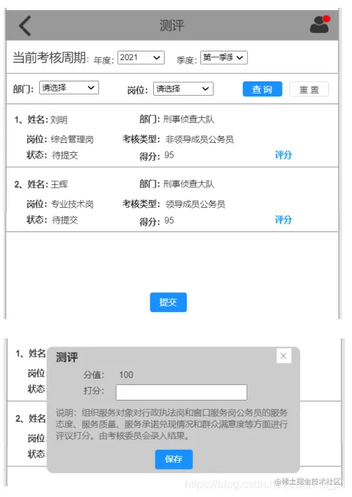 了解主要功能:(1)数据库获取列表数据展示(2)年度、季度、部门、岗位的查询(3)重置(4)点击某一项弹出评分框-获取该条数据打分详情并展示(5)点击保存按钮发送请求、提交数据(6)点击提交按钮按照年份、季度提交所有记录。