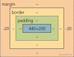 其实不必吃惊,等你缓过神来就会发现这不还是前面讲过的东西吗?盒子所占的空间是包括margin的,也就是说计算该空间时用到的公式是 盒子所占空间 = margin值 + border值 + padding值 + content值,如果margin值为负数,那么想要让子元素所占空间填满父元素的内容区,子元素就必须要增加内容区的长度,所以子元素的内容区长度才变为了440px