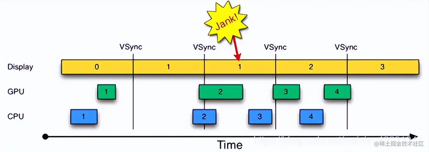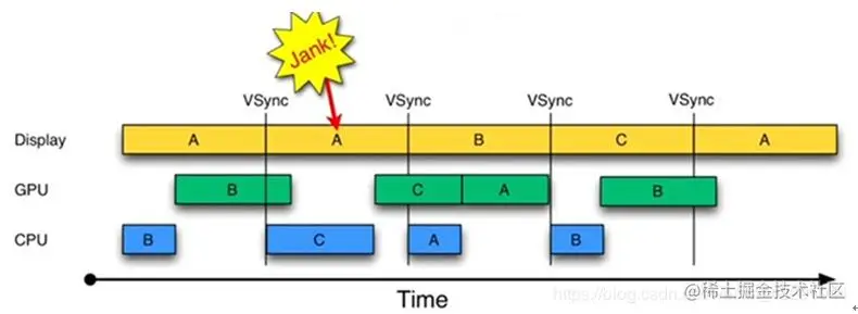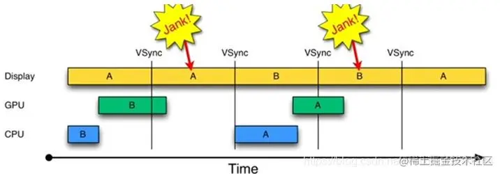 需要展示的A 帧数据没有处理好,Display 继续展示第 B 帧数据(此时屏幕显示是异常的)。由于系统中只存在一块内存给 CPU/GPU 处理绘制,所以在这个 VSync 间隔内 CPU 不处理任何事。