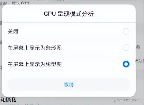在手机的开发者选项中,找到“GPU呈现模式分析”,选择“在adb shell dumpsys gfxinfo中”,如果是华为或荣耀的手机,则选择“在屏幕上显示为线型图”: