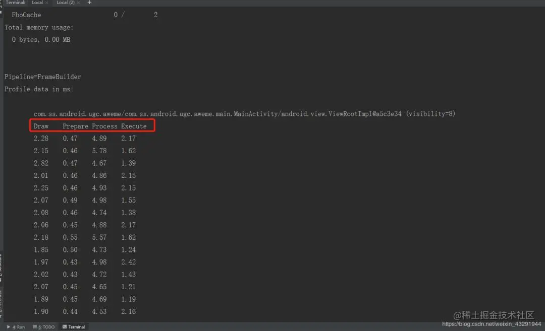 Execute:表示把一帧数据发送到屏幕上排版显示实际花费的时间,其实是实际显示帧数据的后台缓存区与前台缓冲区交换后并将前台缓冲区的内容显示到屏幕上的时间