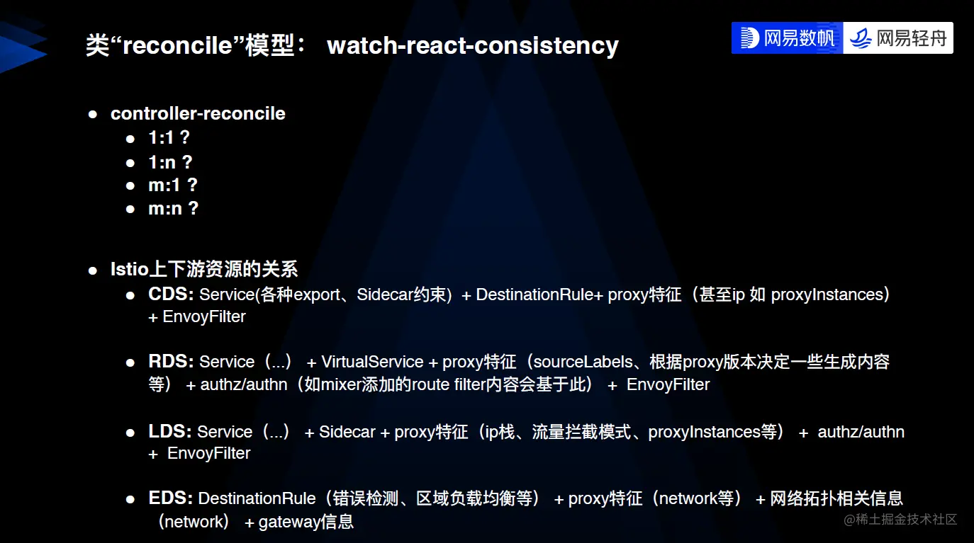 最后一个是 what,就是控制面尽量判断出需要更新的内容,以及 proxy 是不是需要它,或者说是 proxy 需要的内容,因为 proxy 需要的内容是一个下游配置 xDS,需要更新的内容也是这个。这影响到的是推送的数据量,先确定哪些 proxy 是需要被影响到的,同时是需要推送的,再确定需要推送哪些,这是通过一些像资源和 workload 的依赖关系来描述,有一些资源支持 workload selector,还有一些资源是通过 Sidecar 约束的。