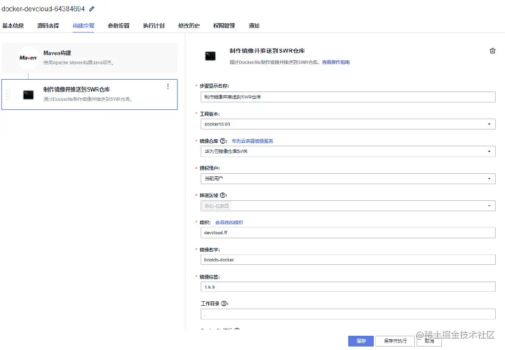 制作镜像并推送到SWR仓库步骤,会通过Dockerfile制作镜像文件并推送到SWR容器镜像服务里,用于后续的部署。此处将组织、镜像名字、镜像标签设置为正确的值(组织需要在SWR中自行创建,可通过点击组织后的“查看我的组织”按钮进入)。