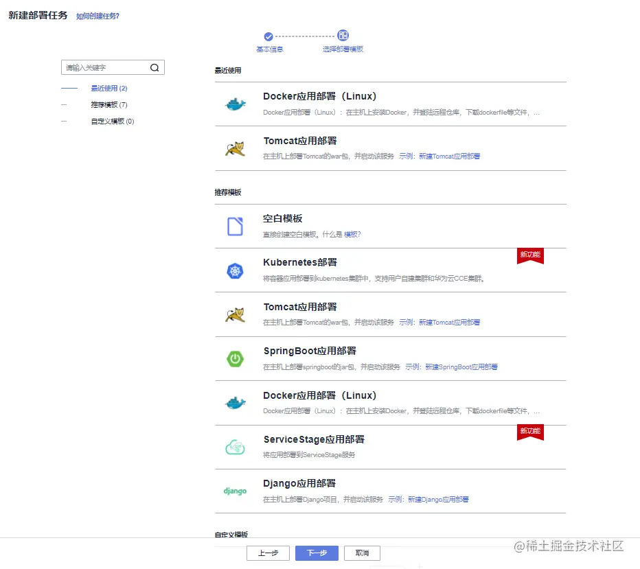 三个项目的部署也各不相同,有的是通过Shell命令部署,有的是Tomcat部署,主机环境也有CentOS 7.6和Ubuntu16.04之分,这些在华为云的部署服务和ECS产品都能够支持和实现。在部署时候也有推荐模板和空白模板两种。