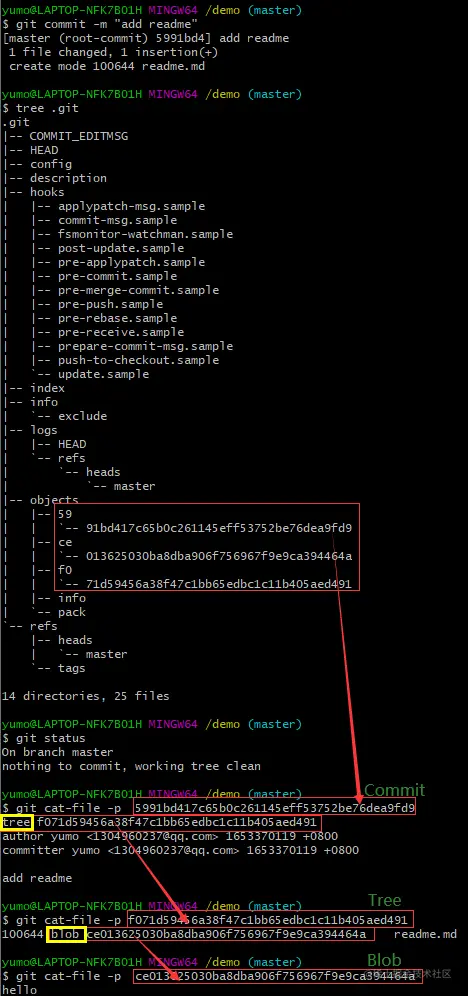 git commit将暂存区代码提交到 Git 存储Objects : commit / tree / blob 在 git 里面统一称为 Objects ,除此之外还有个 tag 的 object