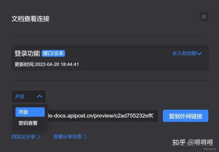 不仅可以定义有效时间还可以定义是否需要密码查看,分享后,别人只需要打开链接即可看到接口的详细定义,超级方便!
