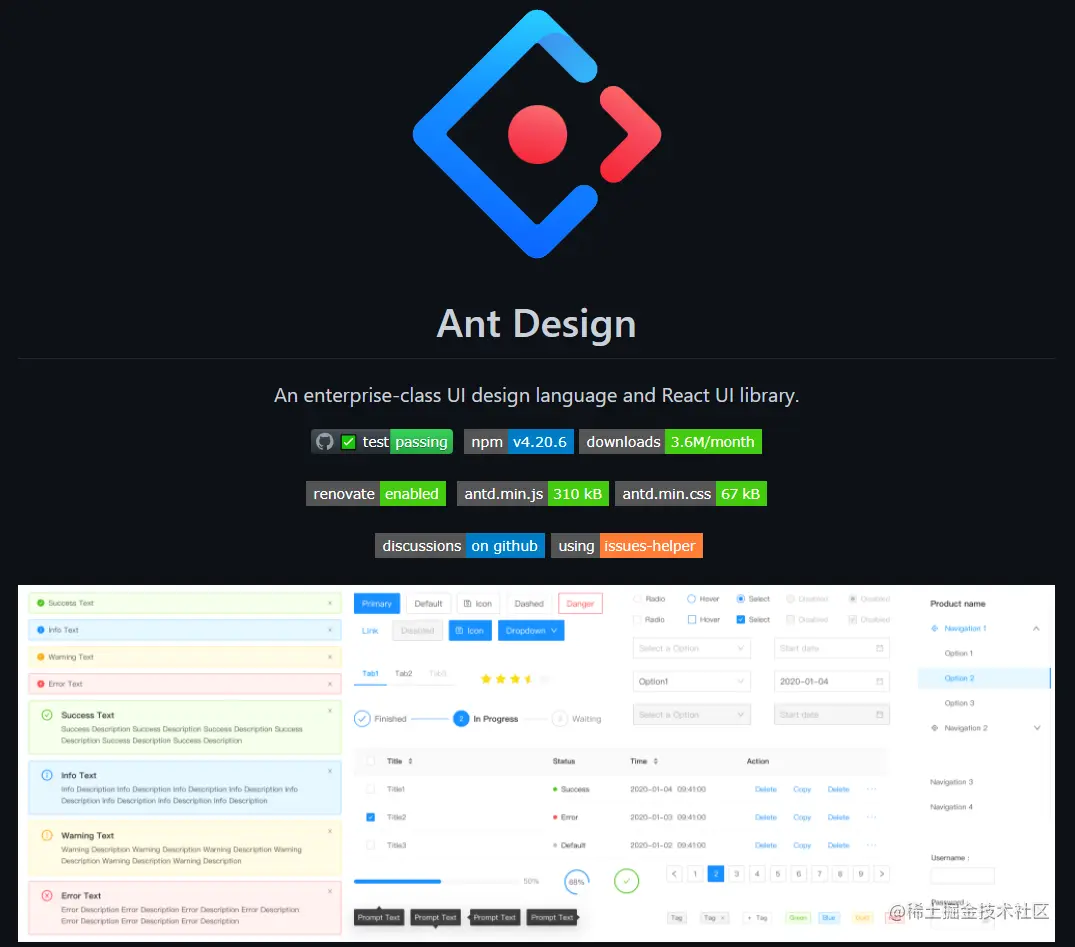 这里的banner就像网站的Banner差不多,展示一下项目Logo也好,大致预览图也好,就是个粗略的预览效果,还可以添加写徽章。我们拿Ant Design举例: