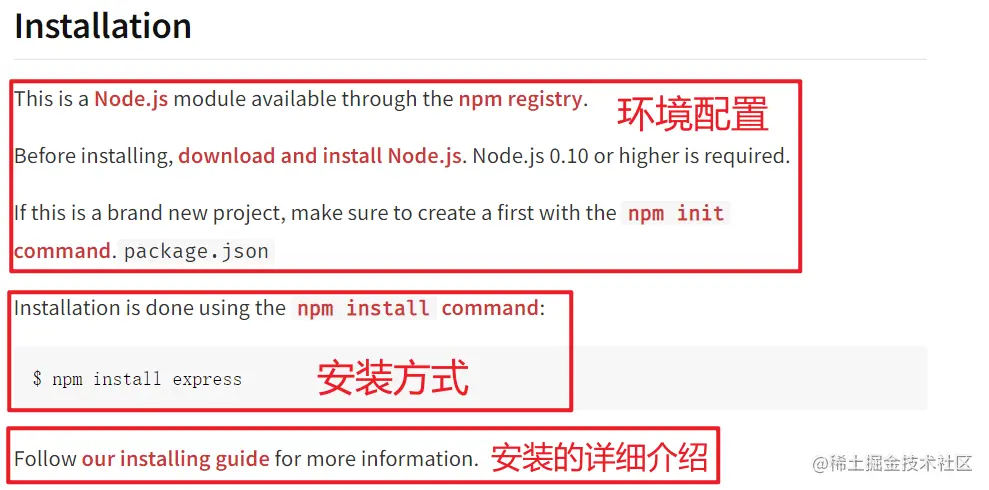 安装部分要说清楚安装需要的环境配置,最好简单给出环境配置的方式。接下来就需要说明如何安装,通过哪些命令安装,安装时需要注意哪些事情。我们看一下下面Express包的README文档是如何写的: