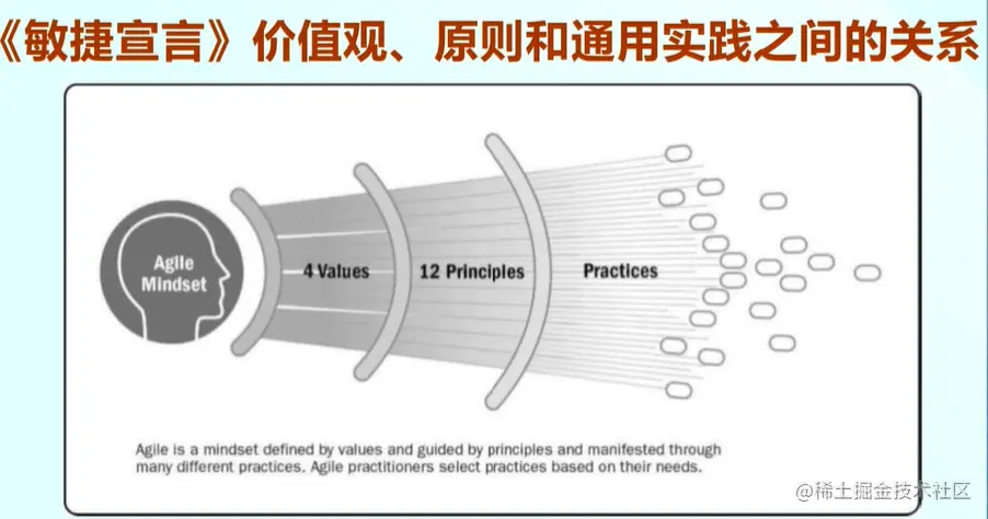 《敏捷宣言》价值观,原则,和通用实践之间的关系: