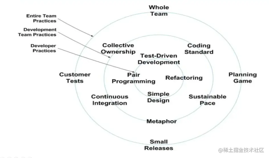 极限编程13个最佳实践是通过整体实践,开发团队实践,开发者实践三个层面来体现。