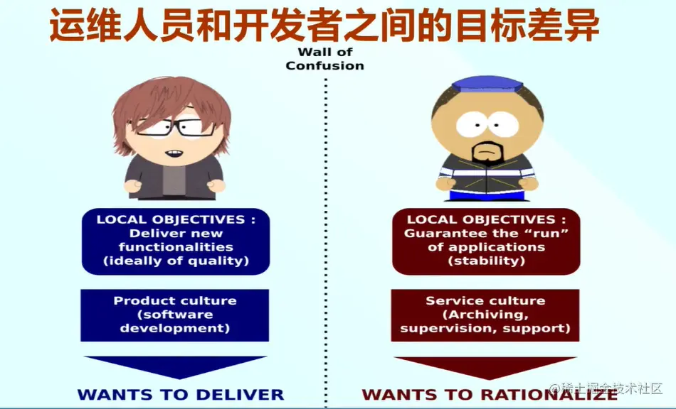 开发和运维原本有着不同的目标,那么开发人员希望尽快提交产品,运维端希望产品的更合理化,高性能高可靠性,减少运维成本。