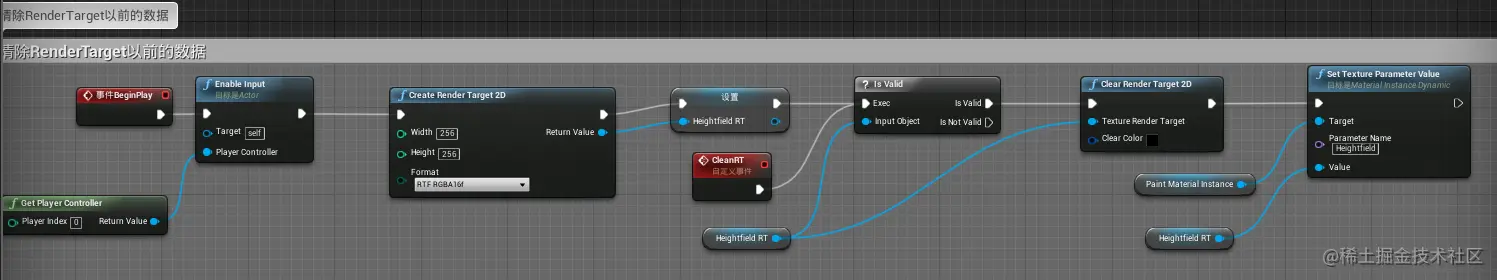 BeginPlay 函数,首先我们要为新建一个 RenderTexture 并保存,同时将 RT 传递给用于 Z 轴偏移的 MAT_HeightfieldPainter 材质。