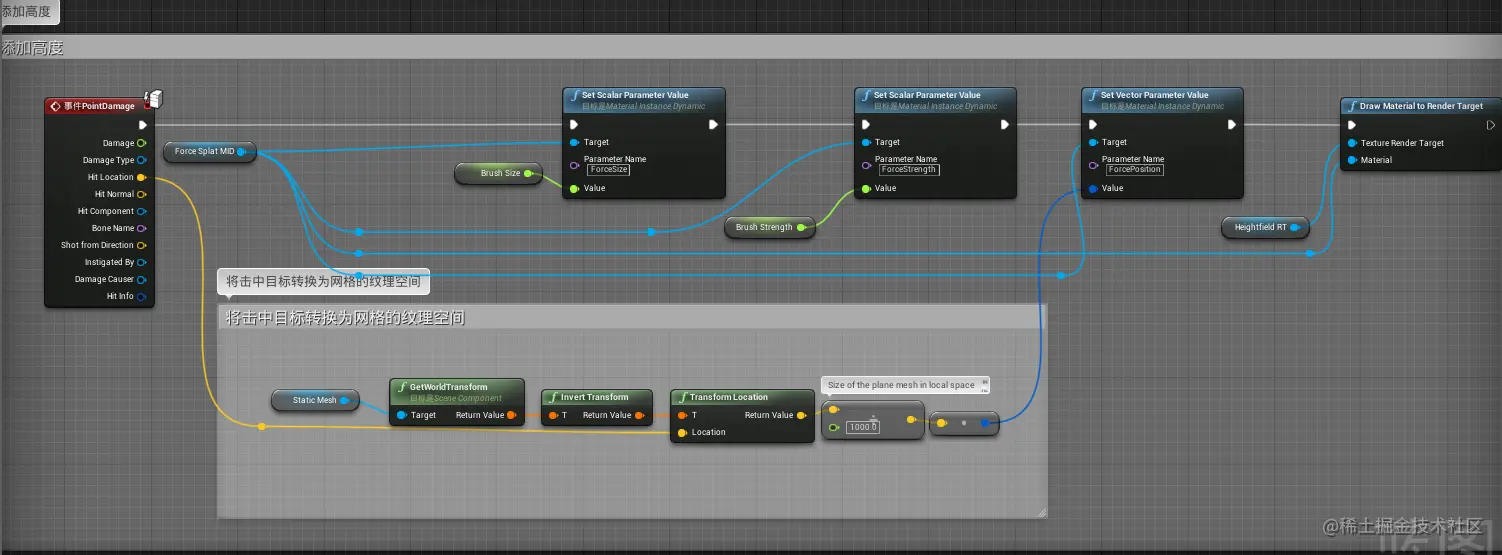最后处理 伤害函数,传递参数给 MAT_ForceSplat 材质,例如点击的 uv 坐标、力度、大小,最后要用 Draw Material to Render Target 函数将 MAT_ForceSplat 材质绘制到 RT 里面,这样 MAT_HeightfieldPainter 材质才会根据 RT 图进行 Z 轴的偏移。