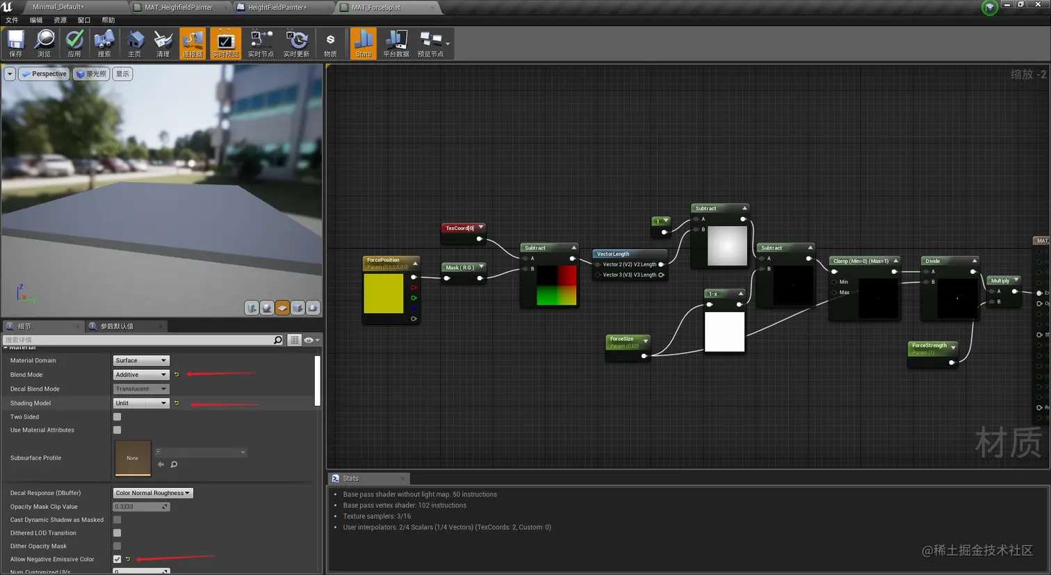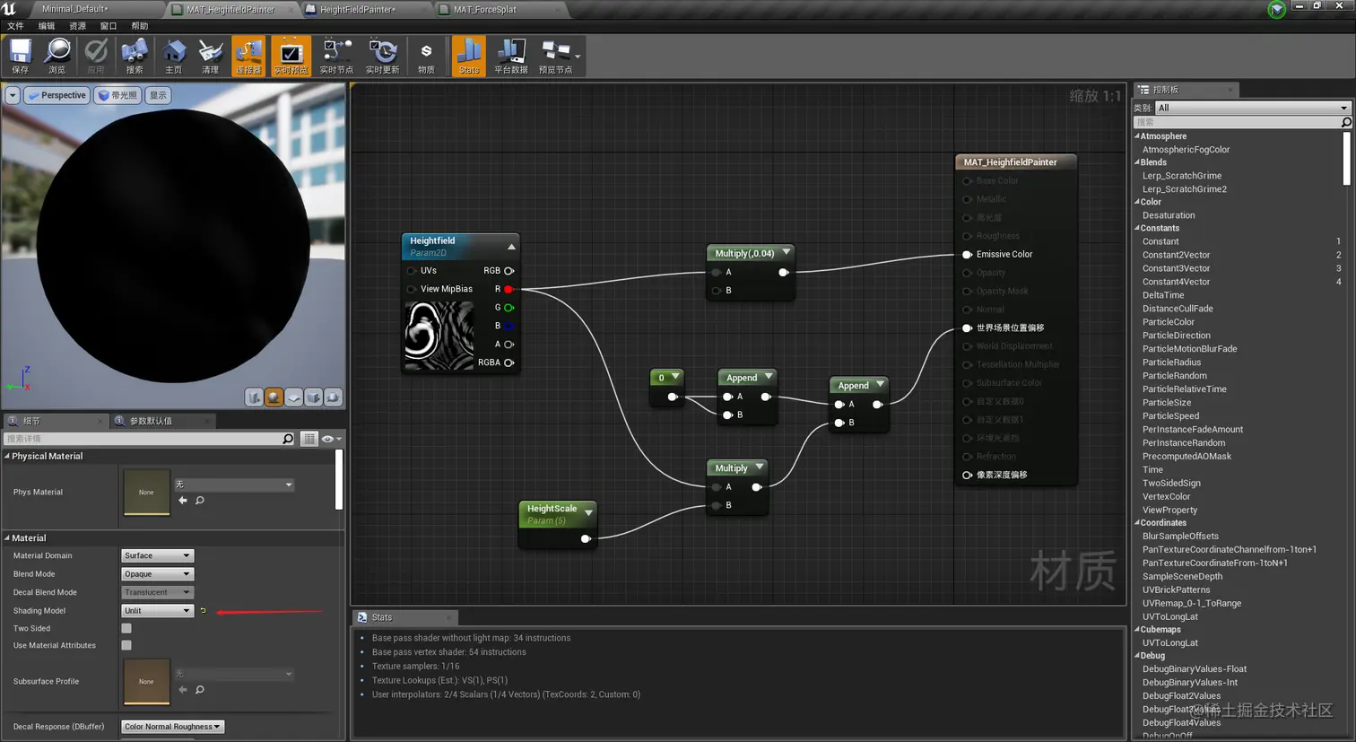 - 首先我们要创建 MAT_HeightfieldPainter 材质,设置如下,注意要把 Shading Model 改为 Unlit 无光照模式。这个材质主要用于 控制物体在 Z 轴的世界偏移(高度变化) 。