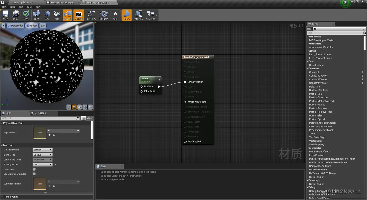在 UE4 中过程化生成噪点纹理是比较昂贵的,所以通常的做法是将材质绘制到 RenderTarget 中。