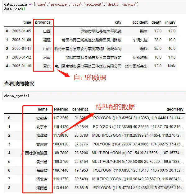 最常见的一个例子就是:在进行地理可视化中,自己收集的数据只保留的缩写,比如北京,广西,新疆,西藏等,但是待匹配的字段数据却是北京市,广西壮族自治区,新疆维吾尔自治区,西藏自治区等,如下。因此就需要有没有一种方式可以很快速便捷的直接进行对应字段的匹配并将结果单独生成一列,就可以用到FuzzyWuzzy库。