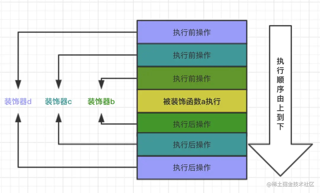 当一个函数 a 被 b,c,d 三个装饰器装饰时,执行顺序如下图所示,多个同理。