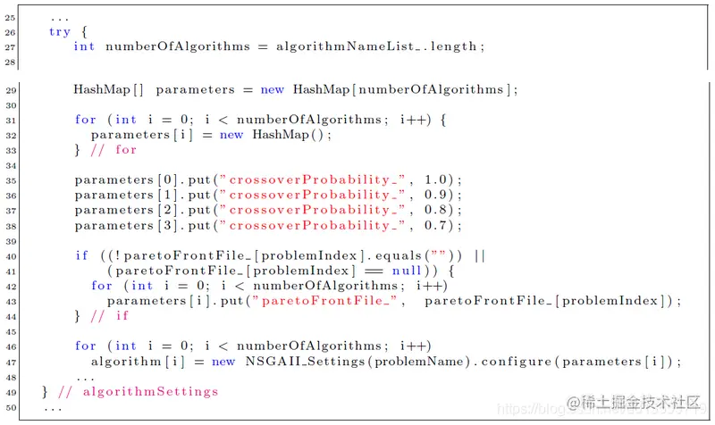 第29行new一个HashMap数组,用于传递不同的算法参数,以在第46-47行new不同的NSGAII实例。