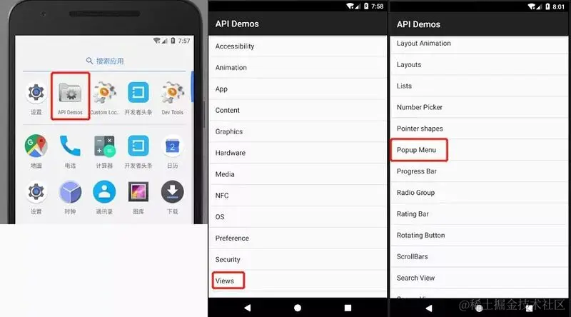 这里利用模拟器中的API Demo做演示,进入APIDemo中Views,然后滑屏寻找“Popup Menu”进行点击操作