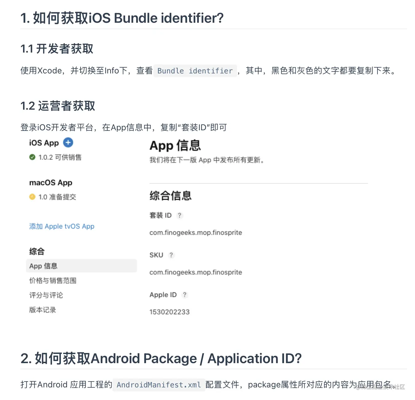 根据提示完成 App 信息的填写,这个的“关联应用”同样需要在 FinClip 管理后台提前进行“应用绑定”设置,什么是 Bundle ID ,如何填写官方也有非常详细的指引,大家可以根据下方的文字找到相应的文档,我在下面也放了官方的说明截图。