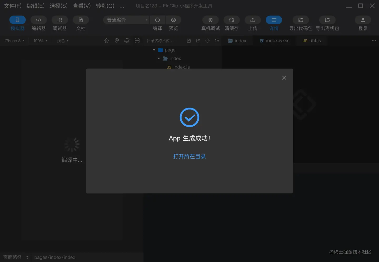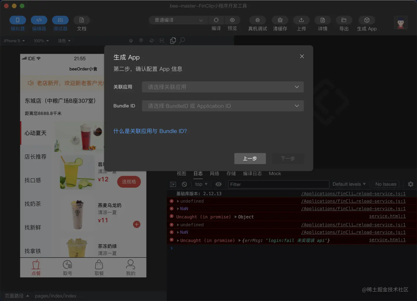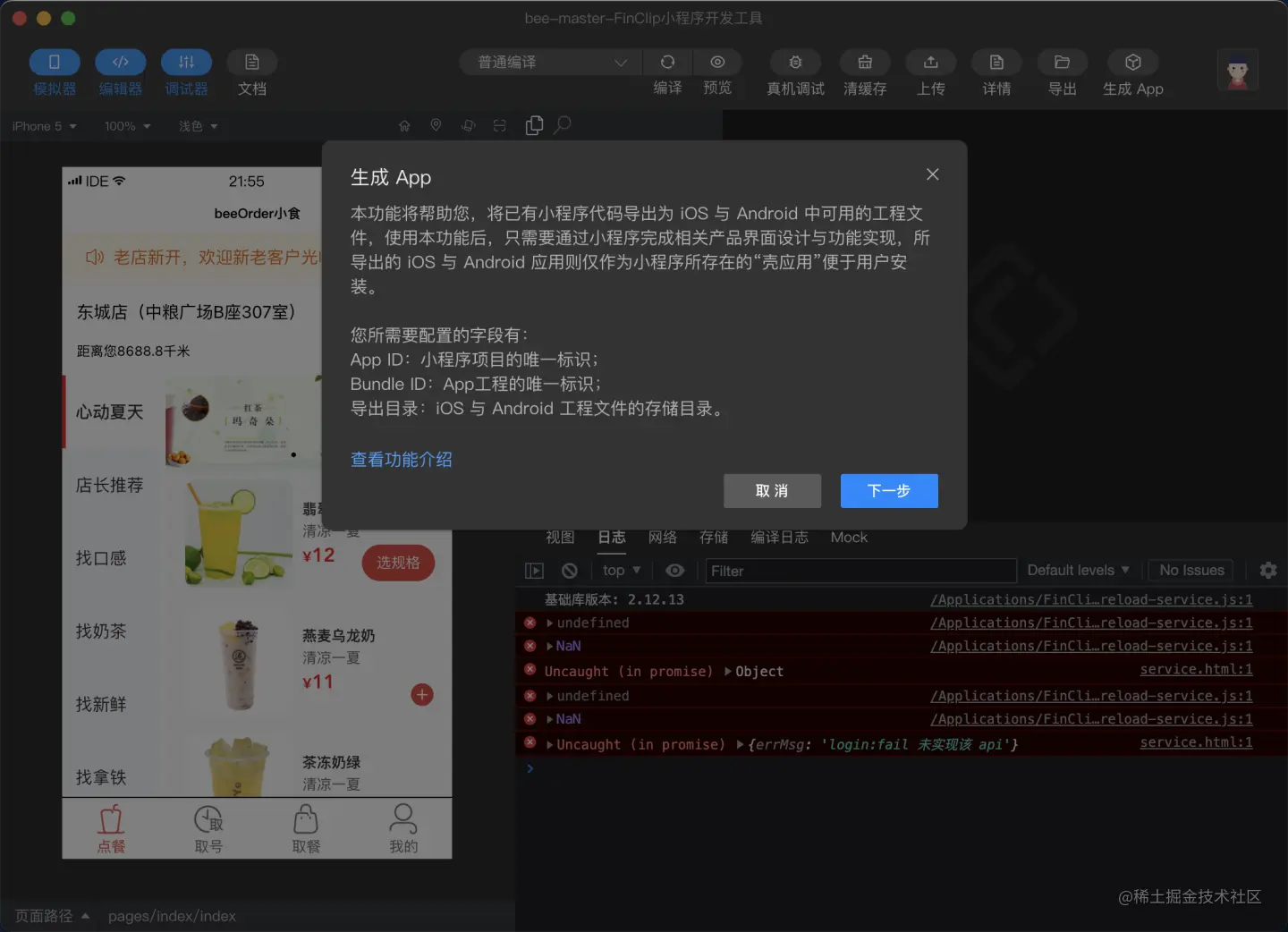 编译完成后会出现小程序运行的界面,此时点击右上角的“生成 App”即可进入打包 App 的正式环节。
