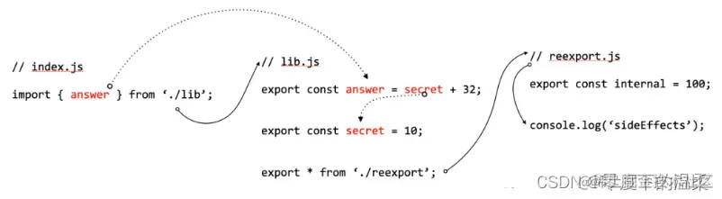 如果都标记的sideEffects:false,那么即使index从lib里引入了internal,但是因为internal来自rexports.js,而index.js里没引入lib.js本身的任何变量,所以lib本身的副作用会被全部跳过。