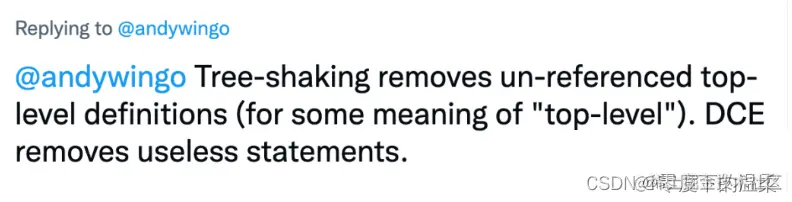 简单来说即是,tree shaking负责移除未引用的top-level 语句,而DCE删除无用的语句。