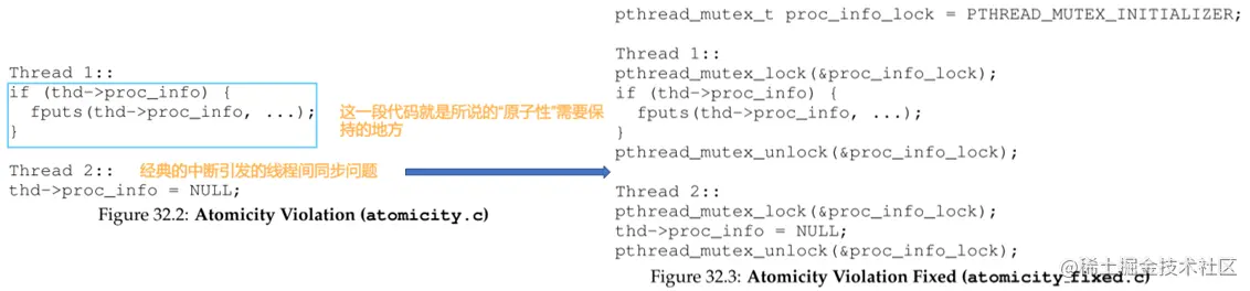 非死锁问题可以分为两种,原子性冲突和顺序冲突。原子性冲突就是我们常见的中断引发的critical section问题。 如下图所示,只要在冲突部分加上锁就可以解决这个问题。