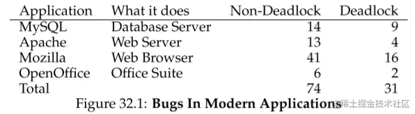 如果从实际应用中总结并发程序的bug,可以发现在MySQL、Apache、Mozilla、OpenOffice这样的成熟的软件里面也会有很多并发Bug,如果将并发Bug分为非死锁和死锁两种,可以得到如下的图片。