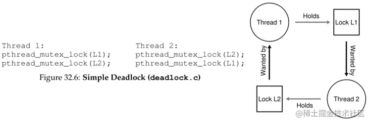 - Hold-and-wait:线程持有分配给它们的资源(例如,它们已经获得的锁),同时等待额外的资源(例如,它们希望获得的锁)。