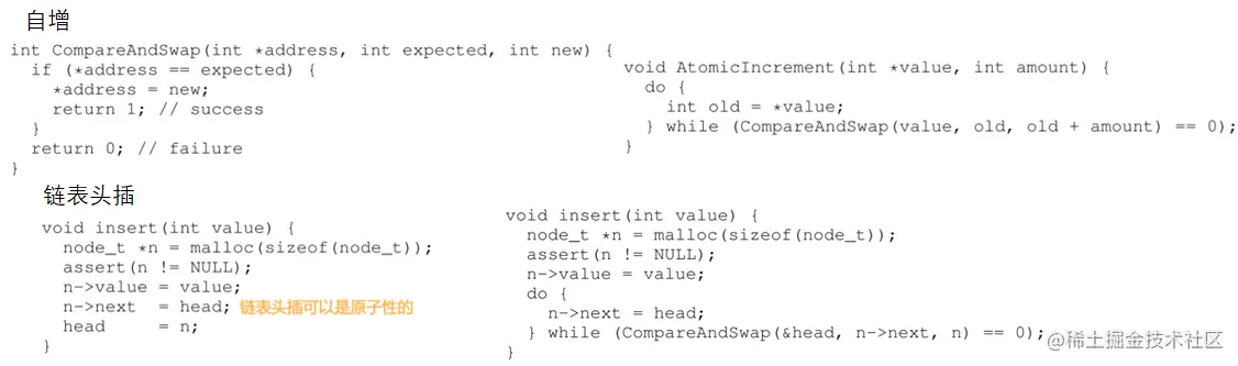 第四个是Mutual Exclusion,最后一个比较根本,完全避免互斥的需要。通常,我们知道这是困难的,因为我们希望运行的代码确实有临界区。那么我们能做什么呢?Herlihy有这样一个想法,即人们可以设计完全没有锁的各种数据结构,具体的说,使用强大的硬件指令,我们确实已经构建了一些不需要锁的并发程序。