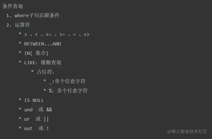 为什么要条件查询 如果没有查询条件,则每次查询所有的行。实际应用中,一般要指定查询的条件。对记录进行过滤。