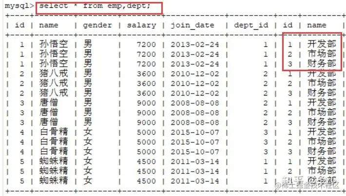 如图,如果不设置条件的话,dept的每条数据和emp的每条数据组合,这样就形成了笛卡尔积现象,这样的查询结果不是我们想要的。