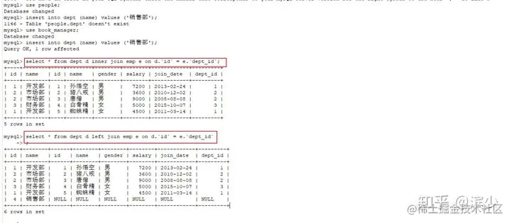 用左边表的记录去匹配右边表的记录,如果符合条件的则显示;否则,显示 NULL 可以理解为:在内连接的基础上保证左表的数据全部显示(左表是部门,右表员工)