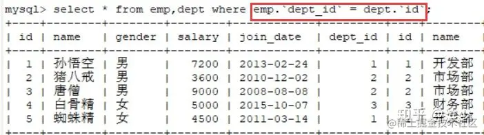 隐式内连接:看不到 JOIN 关键字,条件使用 WHERE 指定 SELECT 字段名 FROM 左表, 右表 WHERE 条件