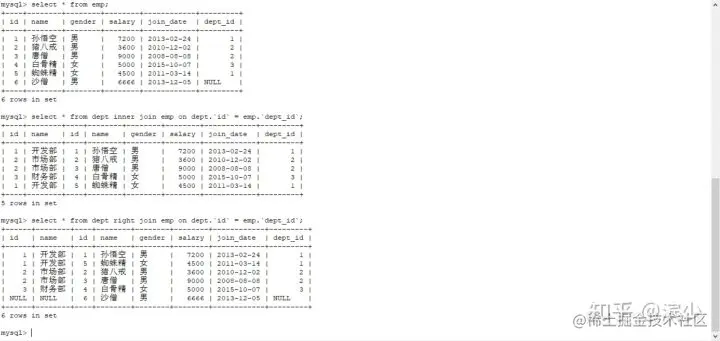 注意:这里的左连接右连接 ,并不是代表表出现在左或者右的位置,表左右的位置在于join,在jion前面写的表,它的字段就会在前面,而join后面的表它的字段就是在后边。看上面两张图,都是dept在前。所谓左连接,右连接里的左右两个字,这是用来决定那边是重要的表,左连接保证的是左表,右连接偏向右表。