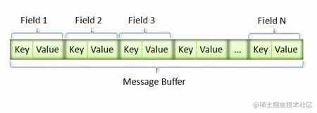 采用这种Key-Pair结构无需使用分隔符来分割不同的Field。对于可选的Field,如果消息中不存在该field,那么在最终的Message Buffer中就没有该field,这些特性都有助于节约消息本身的大小。比如,我们有消息order1: