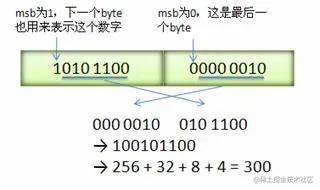 Varint中的每个byte的最高位bit有特殊的含义,如果该位为1,表示后续的byte也是该数字的一部分,如果该位为0,则结束。其他的7个bit都用来表示数字。因此小于128的数字都可以用一个byte表示。大于128的数字,比如300,会用两个字节来表示:1010 1100 0000 0010。下图演示了 Google Protocol Buffer 如何解析两个bytes。注意到最终计算前将两个byte的位置相互交换过一次,这是因为 Google Protocol Buffer 字节序采用little-endian的方式。