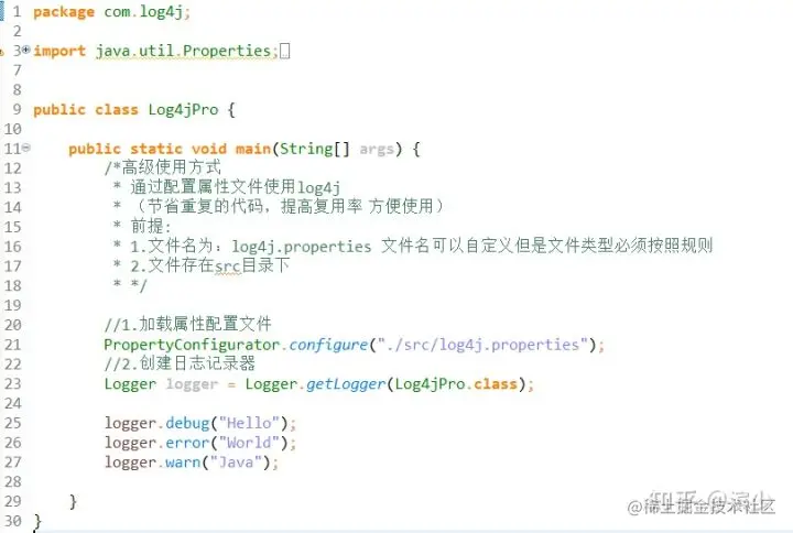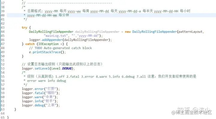 第二种方式是采用设置log4j.properties文件,然后在其他.java文件中设置日志内容。log4j.properties该文件创建一个File类型的文件即可,注意文件名可以自己设置,后缀名需要做到准确无误,上图中的#相当于注释的作用,图中的输出端以及输出格式建议在java文件中写(打几个首字母,按alt+/快速生成的不会错),然后复制粘贴即可,这样为了保证代码不会打错!博主曾被自己手打支配过,建议大家快速生成后复制使用!