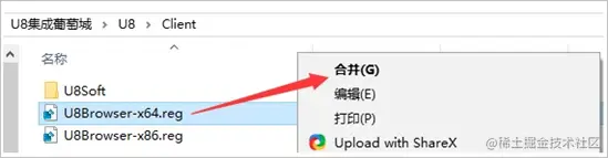 如果是64位的Windows,请右键单击U8Browser-x64.reg,然后点击【合并】。