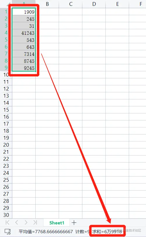 这个方法比较简单粗暴,直接将数据选中,看表格的最下方的求和数值。