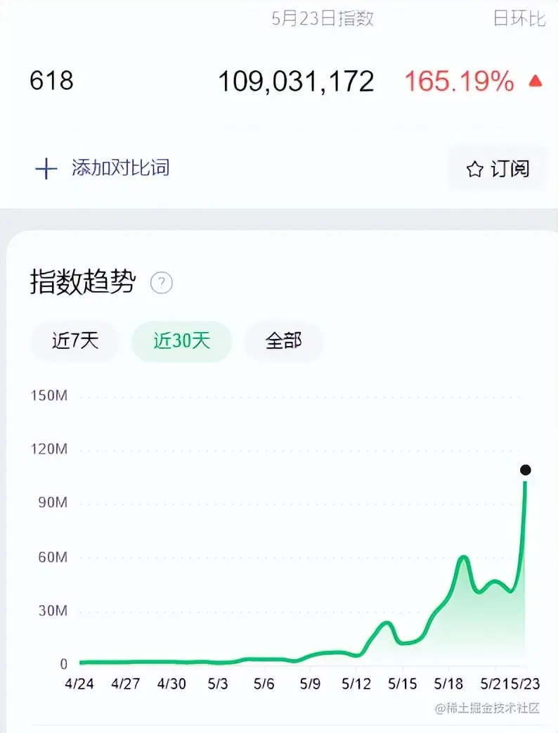 微信指数显示,从5月12日起,“618”微信相关搜索量呈现大幅上升趋势。5月23日,“618”相关搜索量达到峰值超过1.09亿次,远超平常时刻。