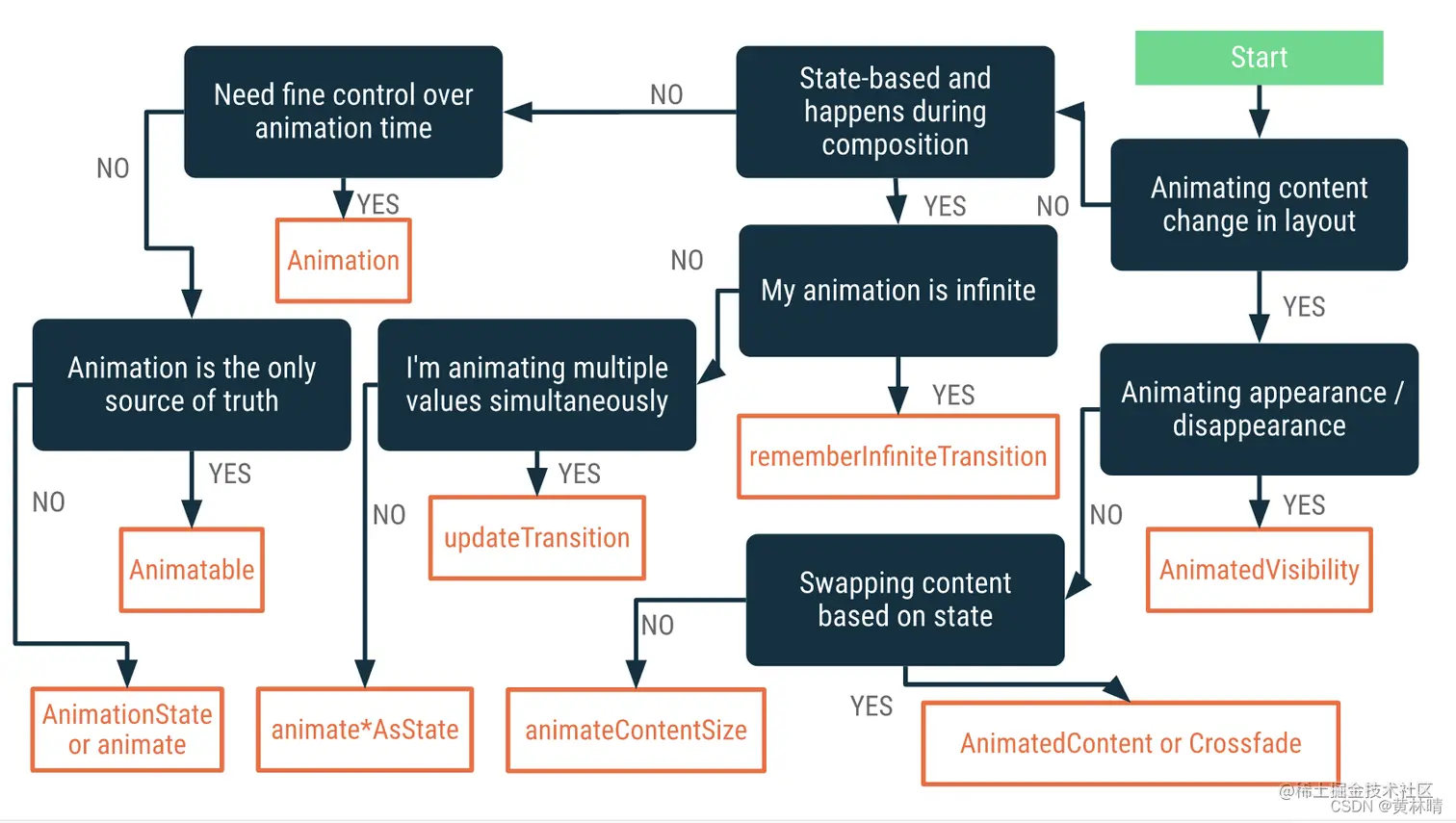 动画的种类就很多,根据使用场景有AnimationVisibility、rememberInfiniteTransition、Animation等。如果你想知道在你的需求场景中需要使用什么动画,可以参照官方的这张流程指示图。