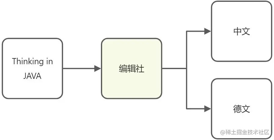 例子:《Thinking in JAVA》很经典,但是都是英文,我们看不懂,所以需要编辑社,将文章翻译成其他语言,这样就可以完成英语与其他语言的交流。 作用: