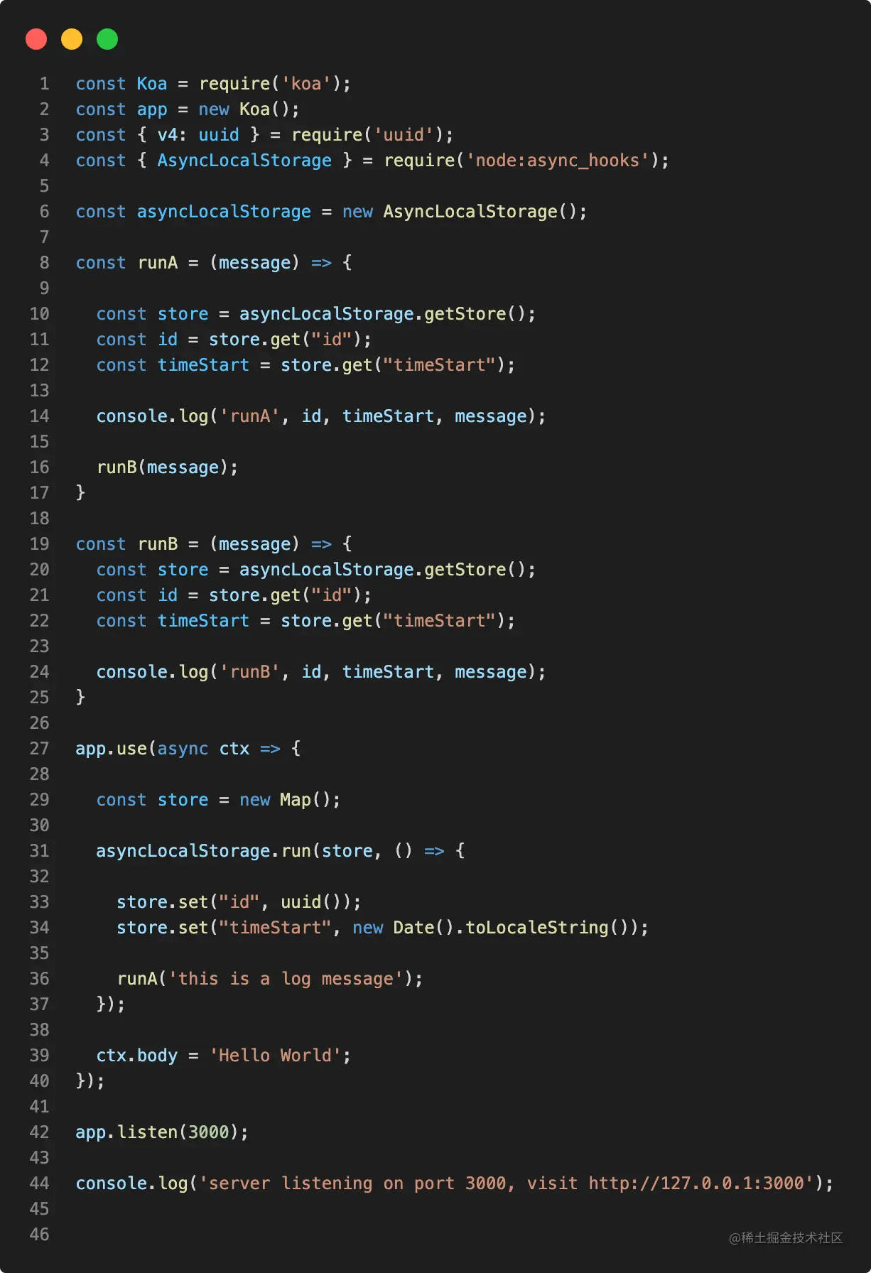 下面通过一个例子来演示如何使用 AsyncLocalStorage 来实现异步资源上下文共享: