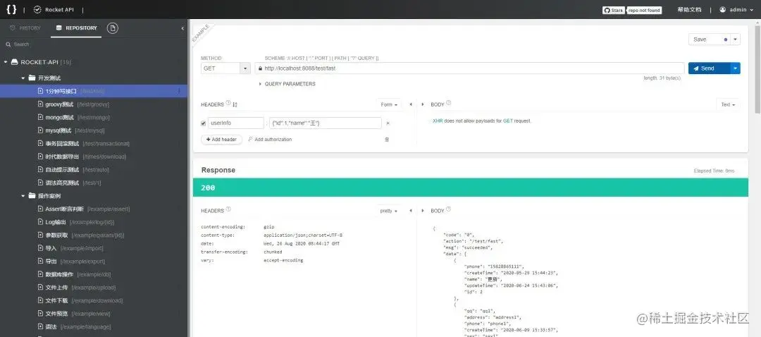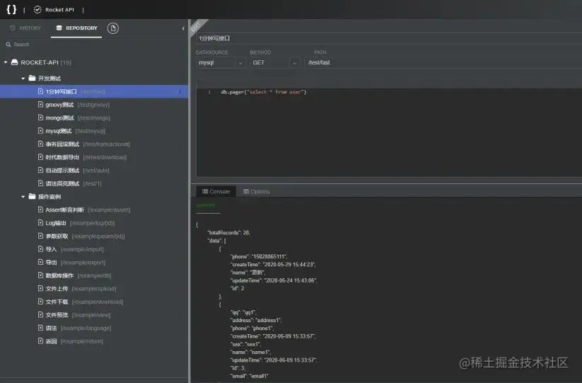 - 传统业务开发,不仅有服务端的开发,还有相对应的文档生成,前后端对接,以及测试配合。“Rocket API” 提供了POSTMAN的操作页面,能够将参数的请求值,请求类型,响应等保存起来,给予前端做真实数据的对接,而不是类yapi,或者swagger之类生成的不能使用的假数据。基于这些真实的请求参数和返回值,提供了外部接口能力,测试团队可以以此来做接口的一键冒烟测试,和文档的一键生成