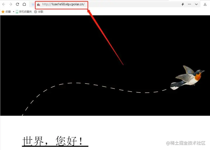 在这里,我们就能更清晰的看到,“公网地址”就是数据隧道的入口,而“本地地址”就是数据隧道的出口,公共互联网的访客可以通过公网地址(隧道入口),访问到本地地址上的网站(隧道出口),反之亦然。也就将本地电子设备上的网页,成功发布到公共互联网上。我们可以将公网地址复制,并在浏览器地址栏中输入,验证该隧道的有效性。