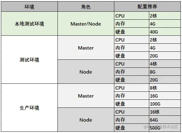 测试环境与生产环境服务器配置推荐如下,本地虚拟机的配置将按照本地测试环境的配置来创建虚拟机。