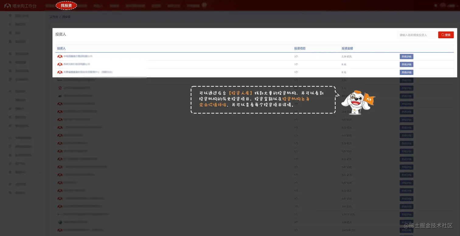 进入塔米狗工作台后,点击“找投资”便可浏览塔米狗所收录的所有投资人以及对应的投资金额与投资项目,点击“查看详情”可查看具体项目详情,帮助企业寻找到合适的投资者。除此之外,“塔米狗”支持交易达人对投资人进行搜索,在塔米狗工作台“找投资”面板的搜索框中输入关键词(如地区名称等)即可获得目标投资者范围。