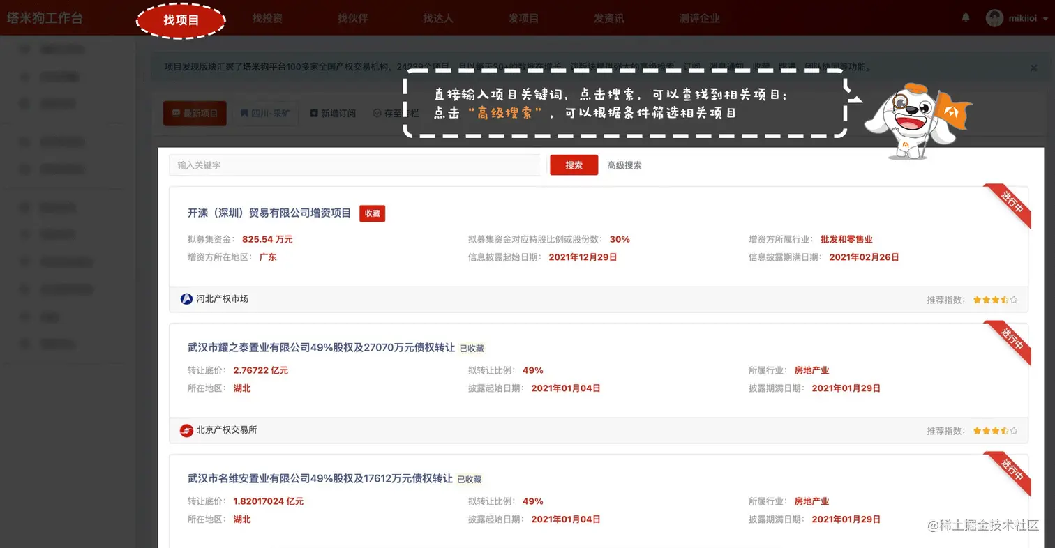 由塔米狗搭建起来的企业投融资信息服务平台,汇集了包括产权交易达人在内的公开要素市场中的等致力于促进项目成交的从业者。依靠强大的大数据与云计算等一系列高新技术,为产权交易市场提供信息服务。对于交易达人来说,塔米狗企业投融资信息服务平台是工作的好帮手,下面为大家介绍交易达人如何有效利用“塔米狗”,提高工作效率。
